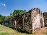 Su construcción y detalles aquitectónicos evocan una época de encanto, magia y misterio; increíbles locaciones para su sesión fotográfica. También se aprecia con claridad la llegada del agua por su acueducto hasta el cárcamo de la rueda, la cual ambienta la capilla durante la ceremonia religiosa… hermoso, ¿cierto?. También se puede ver el trapiche sin techo y otras ruinas de la fábrica que nos ayudan a ambientar tu gran día; su boda. El edificio principal, la casa y su patio central, está en buen estado, al igual que algunos otros salones, pasadisos, dependencias y la barda perimetral.